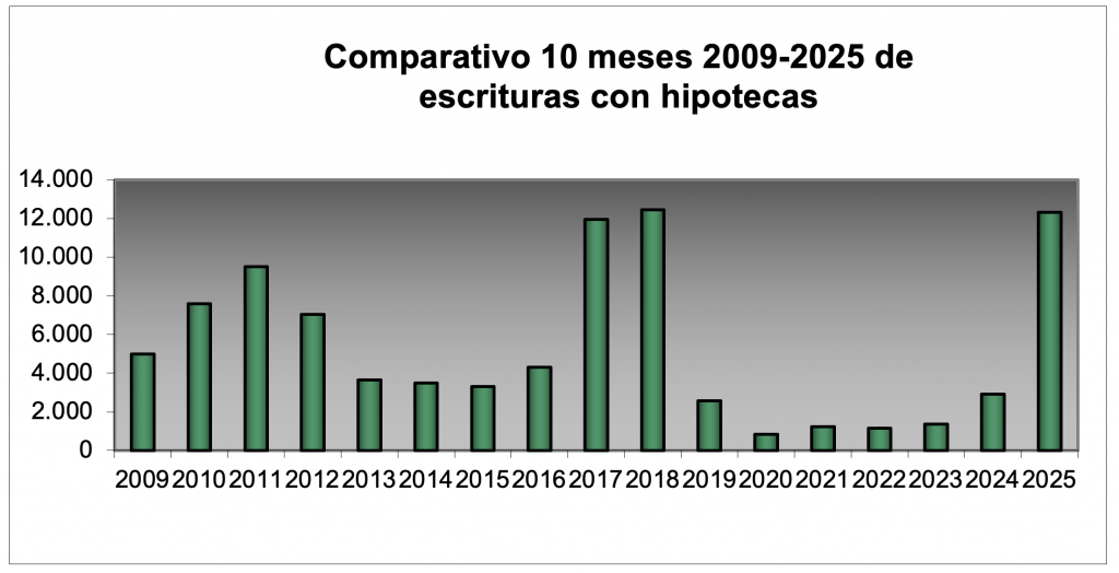 En octubre, hubo 1501 escrituras formalizadas con hipoteca. Por lo que la suba en ese sentido es del59% respecto al mismo mes del año pasado. En los primeros 10 meses se contabilizan 12328(+323%).